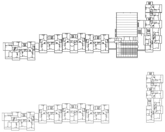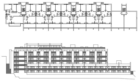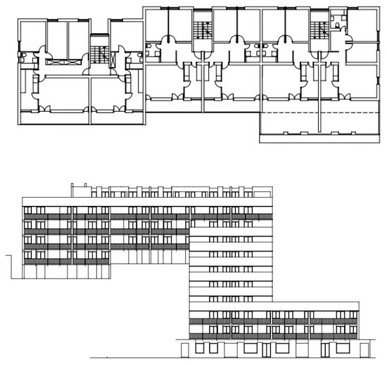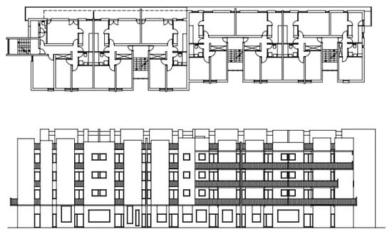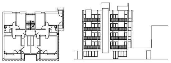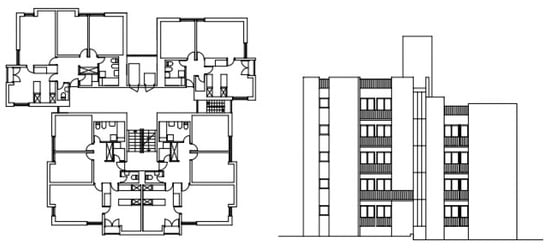 The completed residential block (Figure 5, Figure 6 and Figure 7), shaped as a rectangular prism (cuboid), is a URBS-1 typefied project, designed according to functionalist forming principles [33]. Studied work 1