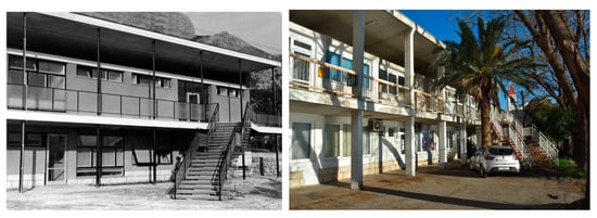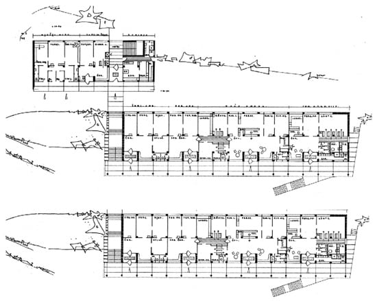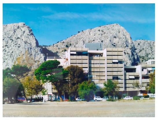 The longitudinal façades are articulated with strip windows, whereas the gable ones—facing the historical core and the Peninsula of Punta—are completely closed. Communication between the square and the spaces on the southeast of the building are rendered impossible by the position and the design of the building. It is precisely due to this inadjustability to the environment, views, and orientation, as well as due to the size and its closed quality, that the building came to be known as a military barracks by the citizens of Omiš. Such typefied buildings were constructed on several locations in Dalmatia (Split, Omiš, Šibenik, and Ploče) on the occasion of constructing new city areas further away from the historical core, where their design qualities in this context have become fully noticeable. These residential settlements, with their slender rectangular buildings surrounded by greenery, can be linked to Gropius’s model of high-rise slab buildings for the unrealized Haselhorst settlement in Berlin from 1929, for which Gropius experimented with the rational use of urban land. These buildings were common in residential areas around the world in the 1960s [64] (pp. 492–494).