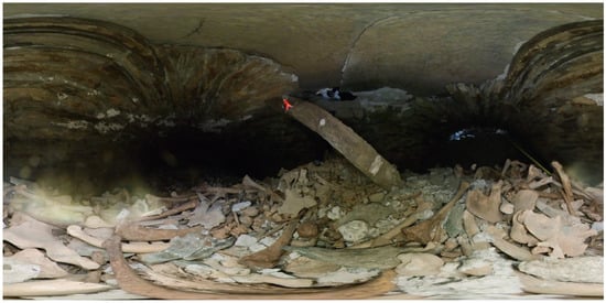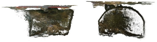 The second vault (Figure 12) had an uncertain shape and a single breach. The single breach in the second burial vault was roughly 0.1 m × 0.12 m. In this second case study, two different acquisitions with the same parameters were carried out inside the burial chamber: the first was aimed at acquiring the inner structure of the chamber and the human remains inside. In contrast, the second one sought to link the inner part of the chamber with the top exterior part visible inside the church’s nave.