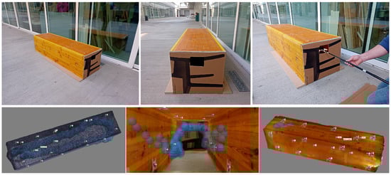 The 360° camera was placed inside the box with an extendible pole, capturing a 58-second video. The frames were extracted with a sampling rate of 2 frames/second, obtaining a total of 116 frames, which were processed in Metashape after setting the spherical camera model (Figure 4).