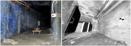 The aim of this experiment was to compare the point cloud captured using 360° videos and a point cloud collected with a Faro Focus S70 laser scanner, which was as the reference for the comparison. The laser was placed on a small cart, capturing four scans inside the tunnel, which were registered using the ICP method, obtaining a registration precision better than ±2 mm. Five checkboard targets were also placed on three surfaces (the entrance and the lateral walls) to obtain a set of control points for the photogrammetric projects, as shown in Figure 5.