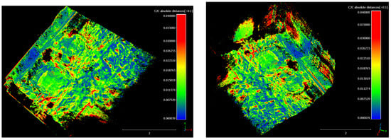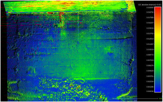 After generating two dense point clouds for the two different photogrammetric projects, the comparison was carried out with CloudCompare software, estimating the discrepancy with a comparison extended to the four walls of the tunnel. Both photogrammetric projects provided very similar results, with an overall discrepancy of 0.008 m ± 0.006 m, as shown in Figure 6.