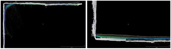 An image with the textured mesh (about 1.8 million faces) with the camera locations is shown in Figure 10. The photogrammetric project was scaled by inserting a small scalebar. The space covers a surface of approximately 4.3 m × 1.9 m, and sections extracted from the mesh show an average thickness of about m, which is not a constant value.