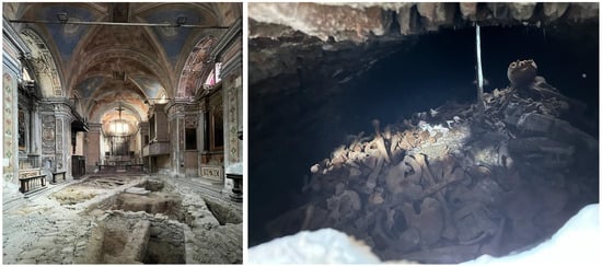 The church of SS. Giacomo e Filippo is the old parish church of Chiesa in Valmalenco (Italy). The first church was built during the Middle Ages (11th century). The building was partially destroyed by a landslide in 1579 and demolished in 1644 when a new structure was built. Archaeological excavations were carried out in 2019–2020 inside the nave, revealing the remains of the old church and several burial contexts belonging to different periods (Figure 8, left). An example of the space to be documented is shown in Figure 8 on the right. As can be seen, a photo acquired from the breach does not provide a good view of the space, and its real inner size is not clear.