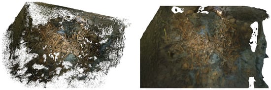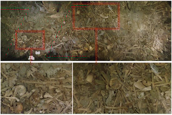 The reconstruction of the human bones is observable in Figure 16. In this second burial vault, the larger and smaller dimensions of the breach did not allow a uniform survey of the area, leading to some holes in the final reconstruction. In addition, the larger empty volume led to some poor lighting in the corners.