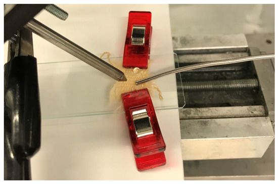 The optimum solvent flow rate for DESI-MS has been shown to be highly dependent on the surface being analyzed [21,22,23]. In contrast to DESI-MS analysis of biological and forensic samples, higher flow rates were required when analyzing cloth. The greatest signal-to-noise ratio of the rhodamine B [M-Cl]+ and background peaks was achieved at 750 µL h−1 [15], which is significantly higher than standard flow rates for biological and forensic samples (90–300 µL h−1) [18,20,24]. The high flow rate required for textile samples has been reported previously [13], and it is likely needed due to the wicking properties of tightly woven cloths, reducing the formation of the thin liquid layer on the sample surface required for the proposed “droplet pick-up” mechanism for analyte transport [25]. Too low a flow rate resulted in the need for longer analytical times and gave a lower ion intensity, while higher flow rates (1500–1800 µL h−1) resulted in the formation of water droplets on the cloth surface, particularly on wool (Figure 2).