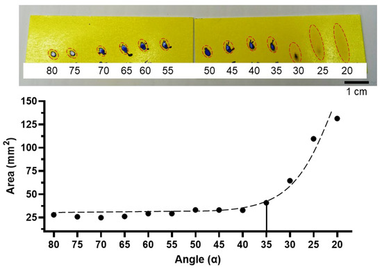 Solvent-sensitive paper (Pentair Hypro, Agratech NW Ltd., Rossendale, UK) showing the effect of different sprayer incident angles on the solvent (3:1 v/v CH3CN:H2O) spot shape and size. The solvent spot margins are marked by dotted lines. The measured area (mm2) within the dotted lines is graphed below. The fitted curve is for data visualization only. An angle, α, of 35° is highlighted to show the critical point before the rapid increase in spot areas.