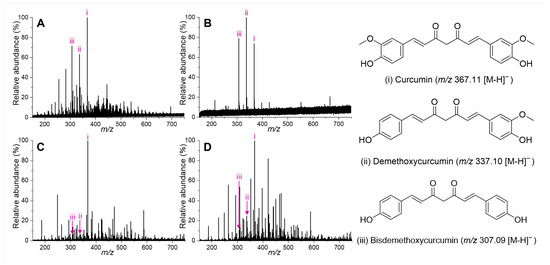 A signal from all three turmeric components could be seen on both the silk and wool cloth (Figure 4C,D), although these signals were less intense than they were for the fresh and powder turmeric samples (Figure 4A,B), and many background peaks could be seen. However, the signals were stable across the 20 mass spectra collected and showed a signal-to-noise ratio above 3:1, which is the common limit of detection used in the signal-to-noise method. The lower intensity peaks of turmeric compared to rhodamine B and the other early synthetic dyes tested show that the optimized set-up for early synthetic dyes [15] is not directly translatable to natural dyes and makes it likely that the lower ion abundance seen for the chromophores can be increased by optimizing the DESI parameters on a natural direct dye such as turmeric.