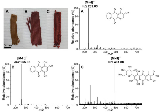 (A): Silk cloth dyed with alizarin, molecular ion labeled in mass spectrum A. (B): Silk cloth dyed with purpurin, molecular ion labeled in mass spectrum B. (C): Silk cloth dyed with carminic acid, molecular ion labeled in mass spectrum C.