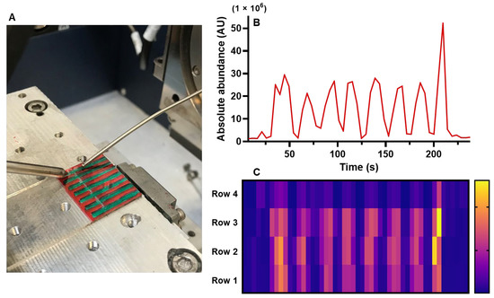 (A): Photograph of imaging set-up with rhodamine B and a green ink in lines on a glass slide. (B): Extracted ion chromatogram (m/z 443.23) recorded for row 3 showing the absolute ion abundance of rhodamine B recorded across the experimental time. (C): Heat map constructed from the extracted ion chromatogram (m/z 443.23) of rhodamine B showing the lines of the painted design on the glass slide. Graph constructed in GraphPad Prism 9.5.1 (GraphPad Software, LLC, San Diego, CA, USA).
