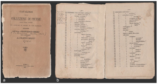 Francesco Belli’s collection, preserved and exhibited in the Earth Sciences Museum of the University of Bari, was studied for the first time about ten years ago thanks to a valorization project designed by the SIMA, Sistema Museale di Ateneo—University Museum organization (at that time CISMUS, Centro Interdipartimentale di Servizi per la Museologia Scientifica—Interdepartmental Center of Services for Scientific Museology), an institution that includes all the Bari University museums, and funded by the Banco di Napoli Foundation. In that circumstance, the importance and potential value of the collection were further highlighted thanks to its variability, the number of samples, the presence of three kinds of labels, and an accurate catalog in which the provenance and rarity of each marble were reported [41]. Belli’s collection was organized in Rome by lower Francesco Belli in 1850 and, afterward, by his son Filippo, who arranged the rich collection of marbles and stones and wrote a detailed catalog (Figure 3). The collection and its catalog were improved by Filippo Belli, who completed the document with his notes and probably replaced some labels. The collection was purchased by the University of Bari in 1957 by the Roman antiquarian Tito Calvesi [42]. Nevertheless, news of the acquisition of the collection by the university did not spread at least until 1992, when Paola Bozzini [43] affirmed that the only collection created by Francesco Belli, which remained unsold and inherited by his son Filippo, had a very high value but that it was lost.