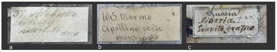 Observation of Belli’s collection samples highlighted the good reliability of the collector in finding, annotating, and sharing correct information about the marble names and then provenances. As usual among nineteenth-century collectors and antiquarians, the names attributed to each tile were very imaginative and based on aesthetic as well as scientific characteristics.