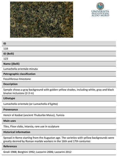 Even Belli’s collection, although attributions to the well-known marble lithologies tend to be correct, contained about 40 samples, above all, marmor chium, marmor luculleum, and alabasters, for which no indicative names were reported. For this reason, the tiles were reorganized, maintaining the original numbering and nomenclature used by the collectors. However, they were allocated a different clustering based on a correction of the attribution in order to facilitate consultation and also for archaeologists and, therefore, also geologists and earth sciences scientists.
