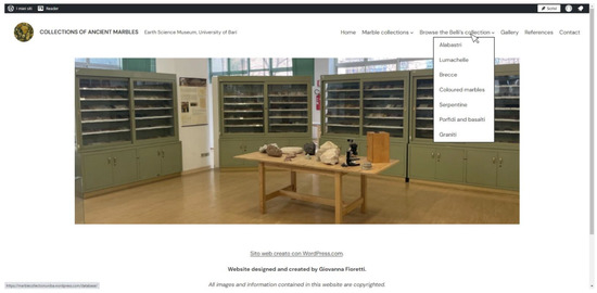 In order to share Belli’s collection and the new Armenise’s collection, a dedicated website (https://marblecollectionuniba.wordpress.com/, accessed on 1 April 2023) was created, registering a free domain and using the WordPress platform (Figure 8).