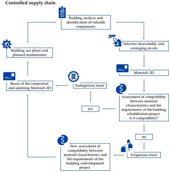 Otherwise, if the component is not compatible for endogenous reuse, compatibility for reuse at a redevelopment site located in a local dimension [46] may be assessed through exogenous reuse [45]; this is to ensure that the environmental and economic benefit from reuse is marred by the incidence of transportation. In the time between the selective demolition phase and the exogenous reuse phase, components will need to be temporarily stored under conditions that ensure that their performance is maintained. To this end, the creation of a local digital network for the exchange of materials, aimed at increasing the chances of reuse by reducing the time spent in temporary storage, is of paramount importance. The temporary storage stay, in fact, should not exceed the estimated time of six months, in order not to burden the construction operator with long-term storage (with consequent difficulties, including logistical ones), which could turn into a deterrent to voluntary exogenous reuse processes.