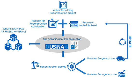 The case in question refers to an intervention following the earthquake of 6 April, 2009, in L’Aquila. The method applied in this case involves the creation of a territorial laboratory as an incubator for all the recovery materials to be sorted in the various post-earthquake construction sites. This laboratory could be managed by the special offices for reconstruction (USRA and USRC) which represent a hub linking the designers and the contractors (Figure 4). The designers will have to enter the preliminary technical data sheets of the recycled materials which are subsequently implemented by the company on the basis of the as built and finally the technical data will have to be tested and entered in the laboratory in order to certify the material for subsequent use in other reconstruction buildings. All information on materials must be available on a platform open to sector operators.