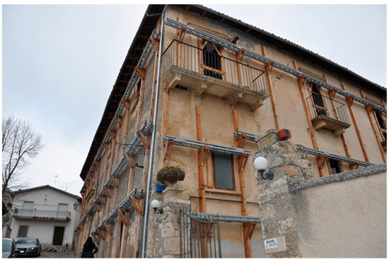 Corner of facade of “palazzo Galeota” facing Galeota Street. Post-earthquake 2009 provisional systems are present on the facade.