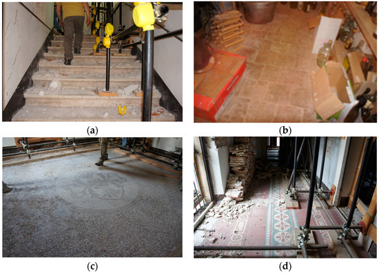 Palazzo Galeota. Photos of the interior details: (a) stone staircase; (b) terracotta floor; (c) Venetian floor; (d) concrete tile floor.