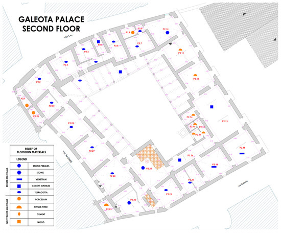 Figure 8 shows the mapping of the floors in order to identify the valuable floors to be recovered. The floors that have been removed and reassembled inside the same building are stone pavers, terracotta, Venetian, marble and stone pebbles. The remaining part of the flooring was removed and replaced with a new material.