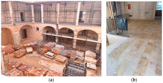 One type of paving that required more careful design is related to local white stone paving slabs. This material is about 6 cm thick. This pavement was removed to allow for the consolidation of the vaults underneath with the subsequent installation of an underfloor radiant panel heating system (Figure 9, Figure 10 and Figure 11).