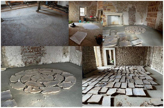 As part of the selective removal of the reclaimed material, which was subsequently stacked in the inner courtyard of the Palace, it was necessary to catalogue and reclassify it through a process of reducing the thickness from 6 cm to 2 cm, with additional material to be used on other rooms of the same building as well, in order to obtain adequate thicknesses of the flooring compatible with the new walking plazas, using materials coeval with the building with endogenous recovery (Figure 9 and Figure 10).