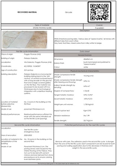 The information inherent in the first life cycle of white stone paving slabs and how each paving component was processed and reused and was entered into the material’s ID; the information is available by scanning the QR code (Figure 11). To enable the proper application of circularity criteria, a proper regulatory and economic approach cannot be ignored. The former should also provide for dictates in the form of protocols, indicating the procedures to be followed in order to proceed to a proper selective removal and cataloguing of materials; the latter should provide for a rating system that can turn into an economic as well as a social incentive, in applying these protocols with the aim of accelerating the green transition with incisive measures and with more sustainable models construction and reconstruction.