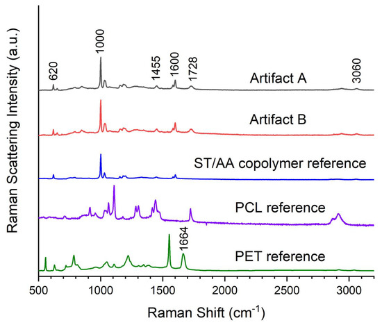 Comparison of Raman spectra for Artifact A, Artifact B, and references ST/AA, PCL, and PET.