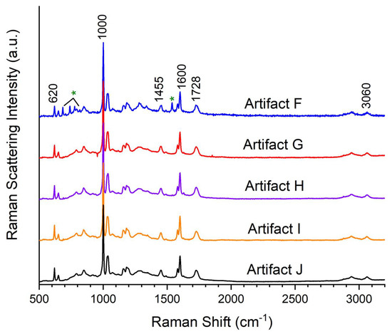 Raman Spectra of Artifacts F, G, H, I, and J. Peaks marked with “*” originate from phthalocyanine green in Artifact F.