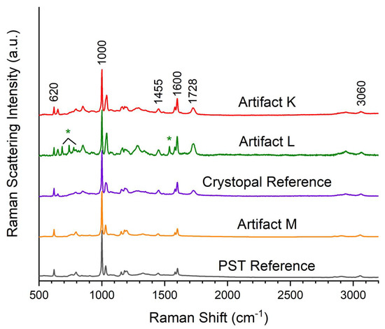 Raman spectra of Artifacts K–M. Peaks marked with “*” originate from phthalocyanine green in Artifact F.
