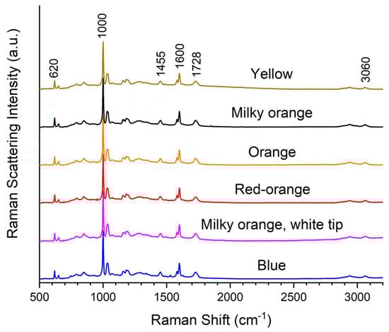 Artifact N (Table 5) is a collection of six small bulb-shaped objects, described by the library catalog as paperweights. They are, however, rather small to function as paperweights. The bulbs are decorative in nature and crafted in different colors. Their material appearance is much like Artifacts A–J, having the characteristic crackled effect. BWID analyses of the Raman spectra (Figure 5) of all six bulbs identify these artifacts as Crystopal with HQI values > 98, matching the Crystopal reference. Visual inspection reveals spectral fingerprints of both polyester and PST, verifying these artifacts are Crystopal. This result lends evidence that Artifacts N were crafted by Winfield or Crystopal, Ltd. Data from SCRC-SUL records [14] and a summary of the Raman analyses for Artifacts A–N are listed in Table 6.