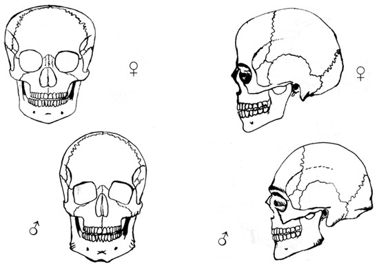 In this paper, the case study focuses on sexual dimorphism in the human skull and the morphological differences between the female and male cranium. The human cranium exhibits some anatomical features different between sexes [31]. For example, the mastoid processes are larger in males, the glabellar region is smoothed in females, and the brow ridge is more developed in male individuals [32,33]. These are some different features used to determine male or female identification (Figure 1). Traditionally, sex identification in human skulls is performed by measuring the presence or absence of discrete morphological traits or identifying their expression rate.