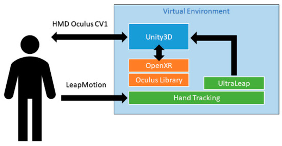 The architecture of the proposed system. The HMD directly provides and receives information to Unity3D, which exploits OpenXR and Oculus libraries for communicating with the device. At the same time, the frontally mounted LeapMotion captures the input from the hands with the IR cameras and, through the UltraLeap library, infers the joints’ positions, which are then provided to Unity3D.