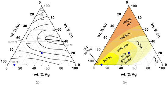 Ternary diagrams of the Au-Ag-Cu alloy showing (a) the phase diagram (adapted and redesigned from [23]) and (b) different colours obtained with different alloy compositions (adapted and redesigned from [5]). The blue dots represent two gold alloys, one with 10 wt.% Ag (yellow colour) and another with 40 wt.% Ag and 20 wt.% Cu (pale greenish yellow colour).