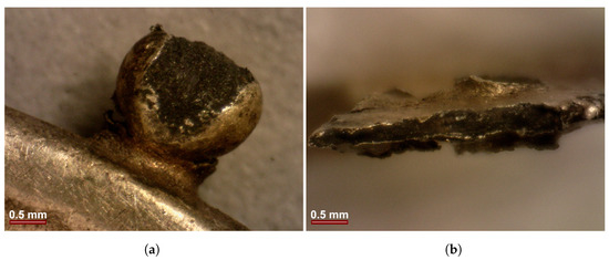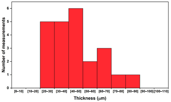 Observation by OM allowed measurements of the thickness of this gold-like coating to be made. The thickness of the coating was measured as between 25 and 85 m, with an average of 45 m (Figure 4).