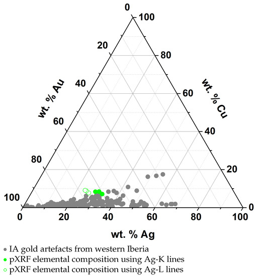 During BA, the alloy composition of the artefacts was mainly related to the composition of the native gold that was used, which varied according to the gold source [8,9]. In western Iberia, native gold sources could be found in the form of small nuggets in alluvial deposits, which would be collected and melted together to produce an artefact [2]. This native gold usually contains 5 to 25 wt.% Ag [10], being this compositional range usual in the BA gold artefacts. Although copper is normally not part of native gold, it can be found in the artefact alloys in low contents, usually <1 wt.% [10,11], and can be understood as a contamination that happened during metallurgical practices, as from copper and bronze metallurgy, which were the most usual metals at the time.