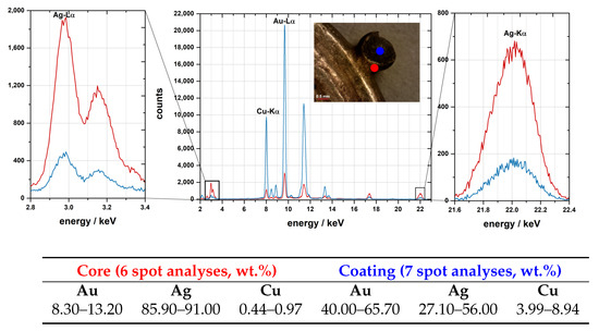 Regarding the SEM-EDS analysis, characteristics X-rays are emitted due to an electron bombardment, providing information of spot areas usually with 1 m diameter and 1 m depth (under normal operating conditions and not very light average atomic weight material) [34]. This means that regarding any characteristic X-rays of Au, Ag or Cu, the SEM-EDS analyses will always be representative of a less deep analysis than the XRF.