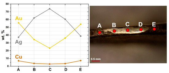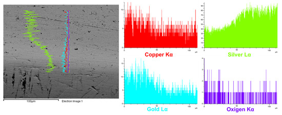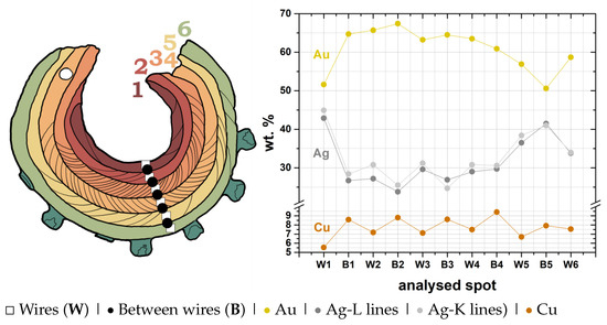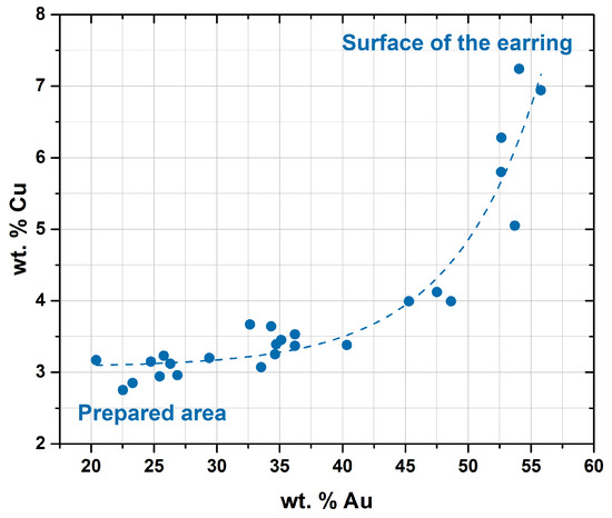 In order to evaluate in greater detail the coating and the wires, the small surface prepared (area 1) was first analysed by micro-XRF with spot analysis made from the surface of the earring towards the central part of the prepared area. The central part of the prepared area corresponds to the deepest region of the wires analysed in this study. The results showed that at the centre of the prepared area Ag increased significantly, up to 75 wt.% Ag, in opposition to adjacent areas, which were Au and Cu-richer (Figure 8). This analysis shows, without any doubt, that the wires were originally made in an Ag-rich alloy, whose original composition is not known through the present analysis since the centre of the prepared area might not be representative of the most internal silver alloy (Au and Cu might continue to diminish at greater depths). On the other hand, a clear positive correlation between Cu and Au (instead of Ag) was observed by numerous micro-XRF analyses made over the prepared surface (1) (Figure 9). This association of Cu to Au, points out to the use of an Au-rich alloy with significant Cu content (when compared to the original Ag core alloy) in the coating, and thus to perform the gilding of the object. The same prepared surface was also analysed by SEM-EDS. An elemental line scan revealed a gradual Ag enrichment towards the centre of the prepared surface, as well as an Au and Cu decrease, proving that the artefact has an interior in a silver-rich alloy and a coating in a gold-copper-rich alloy (Figure 10). This result agrees with those made over the wires and between wires and excludes the possibility of a gilding technique performed by the dissolution of the anodic constituents at the earring’s surface. Also, the absence of Hg in all the analyses (pXRF, micro-XRF and SEM-EDS) indicates that the gilding was not obtained by the technique of mercury gilding [35], which has been a technique previously identified for the gilding of silver parts in torques, from the Late Iron Age (LIA) in northern Iberia [20]. Previous published data on mercury gilded artefacts (using XRF, SEM-EDS and PIXE) [20,36,37] found Hg contents between 2 and 20 wt.%, which would have been easily detected in the present study. Other gilding processes identified in Proto-historic objects from western Iberia have included foil gilding of a bronze artefact [38] and interdiffusion gilding of a copper artefact [16]. Given the compositional gradient observed from the surface of the earring towards the centre of the prepared area (1), a gilding involving a diffusion process seems the most probable in the case of this earring.