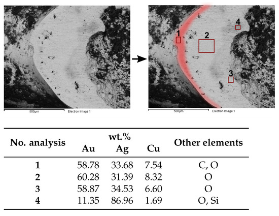 pXRF analyses were carried out in three different areas of the earring to provide an estimation of the overall composition of the artefact and to account for any composition heterogeneity between areas. The results showed a fairly homogeneous composition, with a low standard deviation between the analysed areas (<2%). Results show a gold alloy with 25–30 wt.% Ag and about 8 wt.% Cu (Table 3). If considered only by themselves, the results could be interpreted as being relative to the bulk composition of the earring, which would be within the range of compositions obtained for other IA gold alloys from western Iberia (Figure 5). Considering the values obtained for Ag when using the K or L lines, these show differences of ca. 5 wt.% in all three analyses, with lower values towards the surface of the artefact (using L lines). This difference could be interpreted as a result of corrosion, due to the dissolution of the anodic constituents at the surface of the object. However, further detailed analysis allows the interpretation of these results as something else.