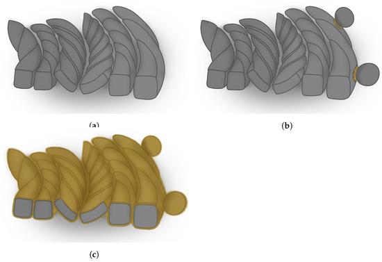 Scheme of a cross-section of the earring showing a proposal for the manufacturing sequence of the earing: (a) six twisted wires made of a Ag alloy; (b) joining the silver granules to the external silver wire using an Au-Cu-rich solder alloy; (c) gilding of the entire object with an Au-Cu-rich alloy of similar composition to the alloy used in (b).