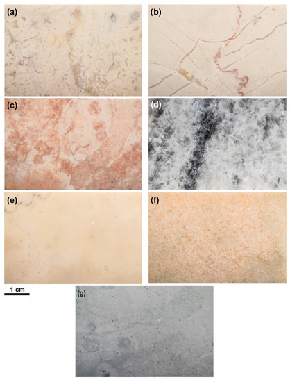 Macroscopic appearance of the lithotypes selected for this study. (a) Lioz A, (b) Alpinina, (c) Lioz B, (d) black and white marble, (e) Lioz C, (f) Rosa marble, (g) blue limestone.