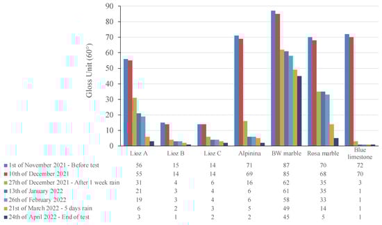 Gloss measurements with 60° of reflected light (Figure 4) showed a decrease in gloss after 1 week of rain, passing from 56 to 31 in Lioz A, from 15 to 4 in Lioz B, from 14 to 6 in Lioz C, and from 72 to 16 in Alpinina. In marbles, gloss decreased from 87 to 62 in BW and from 70 to 35 in Rosa. Blue limestone almost completely lost its gloss (3 gloss units on 27 December 2021, 1 gloss unit on 3 January 2022).