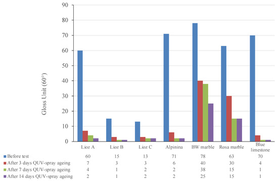 Interpreting the gloss variation monitored after the QUV-spray ageing (Figure 5), a radical decrease in the gloss unit occurred only after three days of ageing in most samples, except in BW and Rosa marbles. Compared with the results obtained after natural ageing, it can be stated that, in this case, three days of QUV-spray chamber ageing correspond to five months of natural ageing. In blue limestone, the correlation is just two months. Considering that, from 1 November to 27 December, just a few mm of rain fell and a minimal reduction in gloss emerged, three days of natural ageing correspond to four months, highlighting that the most important variation took place after 1 week rain in December.