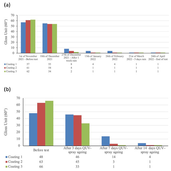 Different results were acquired for coated samples subjected to QUV-spray ageing (Figure 6b). They preserved a certain level of gloss after three days of artificial ageing, as observed from coating 1, which retained some gloss after seven days and a residual value after 14 days. The gloss differences are very relevant when compared to the uncoated blue limestone after one week of rain in December 2021, and also when compared to the blue limestone that was artificially aged for three days. It can be stated that all hydrophobic materials are more efficient in the climatic chamber than in outdoor exposure, as was observed by other authors [18]. During natural ageing, the rainfall accumulation registered in December 2021 was 96.91 mm, concentrated mostly during one week (from the 20th to the 27th), and had a pH of 6.25 and a TDS of 11. In March 2022, from the 20th to the 24th 134.723 mm rainfall accumulated with a pH of 6.5 and a TDS of 11. Additionally, the rainwater collected after four rainy days ending on 13 March 2022 had a pH of 5.93 (Table 1).