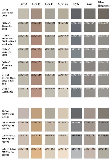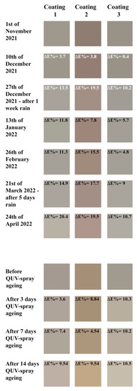 In general, ΔE% does not permit a temporal correlation between natural and artificial ageing in each case due to the wavering trend emerging during the outdoor exposure, as pointed out by [21,38]. Conversely, QUV-spray showed a correlation between temperature, humidity, UVA radiation, and spray.