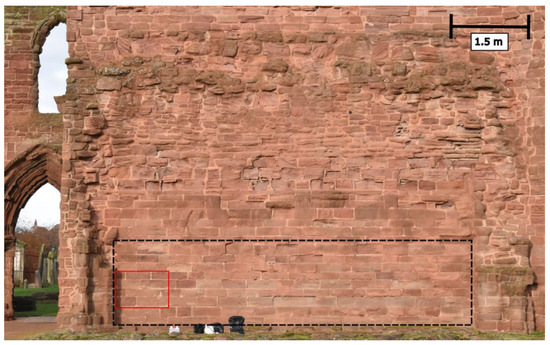 Image of the studied façade at Arbroath Abbey. Black box outlines the boundaries of the area analysed by the moisture meter, and the red box outlines the boundaries of the area that previously had a hydrophobic treatment.