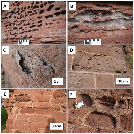 Prominent decay patterns identified at Arbroath Abbey. (A) = alveolisation; (B) = efflorescence and salt deposits; (C) = blistering*; (D) = lamination* (detachment of stone parallel to bedding) (* Prominent patterns on studied façade, including treated test area); (E) = sanding; (F) = differential weathering.