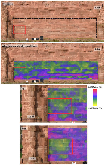 The upper half of the figure shows the relative dry state of the studied façade prior to any wetting. The lower half of the figure shows the treated area (outlined by the red box) before and after wetting of the façade. Yellow/green = relatively dry; pink/purple = relatively wet. Data represented in figure were acquired using an 11 cm probe head.