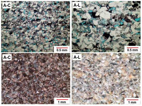 Optical (top) and binocular (bottom) images of studied sandstones A-C and A-L showing key differences in grain size and colour.