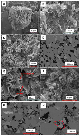 BSE and SEM analysis was carried out on thin sections and sandstone chips that were representative of the interiors of both stones (Figure 9A–H). The average grain size of A-C is 0.11 mm. Grain shape is subrounded where grain boundaries show long and concavo-convex contacts (Figure 9D). The matrix is sparse, although calcite is present both in the matrix and as a cementing material (Figure 9D). There is a higher proportion of lithic grains relative to A-L, and they have weathered extensively, leading to the formation of clay minerals with smectitic morphology (Figure 9A,B). The presence of lithic fragments weathering to smectite in this case is unsurprising given the amount of andesitic debris found locally, which has been recycled into many sandstone types in the area. Clay minerals exist as clasts or very thin grain coatings. The sandstone is poorly sorted and classified as a lithic arkose after Folk, 1974 [30].