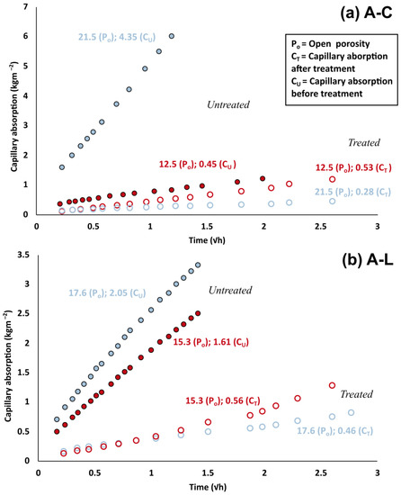 Capillary absorption of (a) A–C (high and low porosity examples) before and after application of hydrophobic treatment and (b) A–L (high and low porosity examples) before and after treatment. Samples before application of hydrophobic treatment are represented by filled circles, and samples after hydrophobic treatment are represented by open circles.